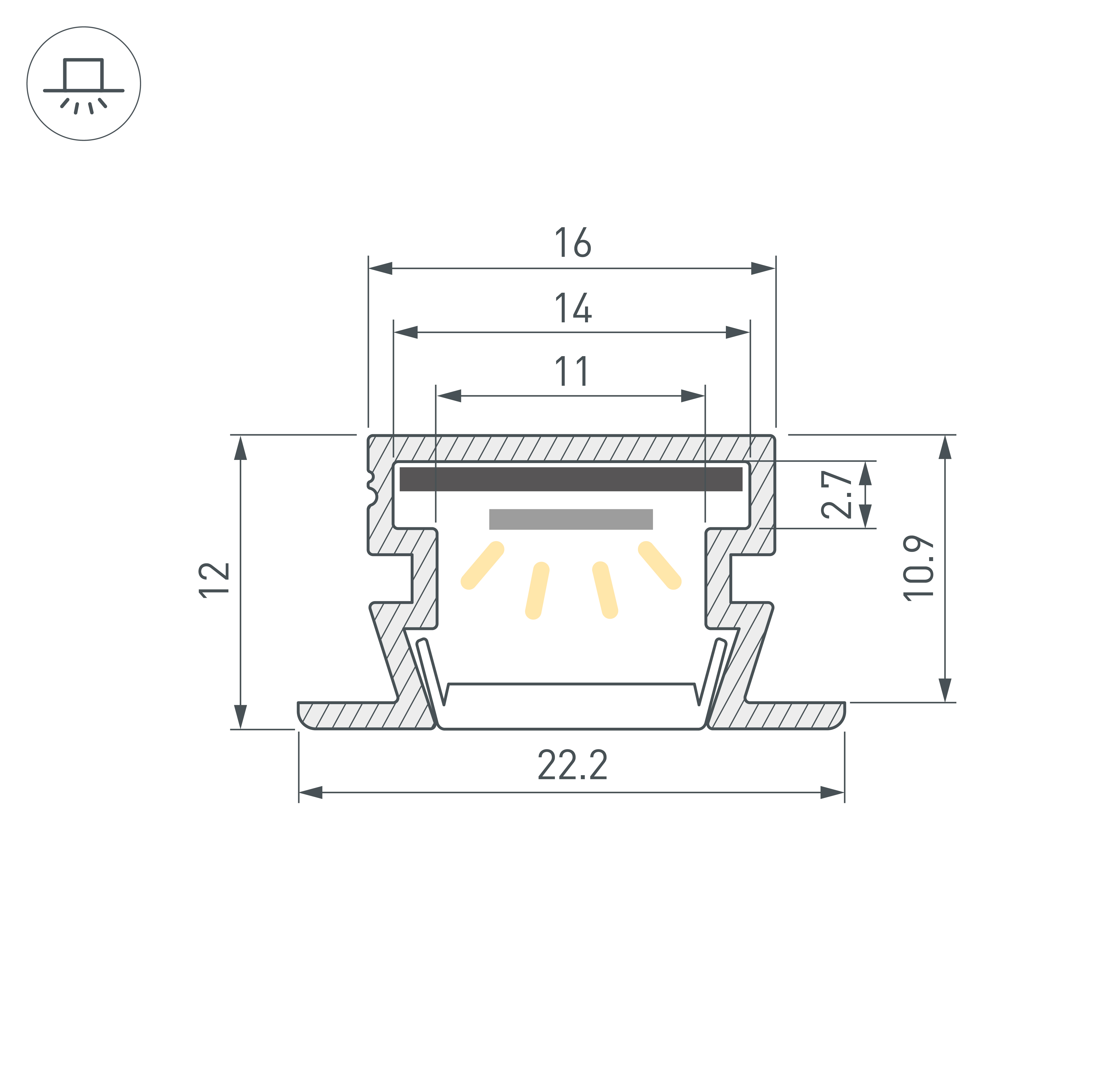 Встраиваемый профиль с накладным фланцем из анодированного алюминия для контурной подсветки. Габаритные размеры профиля составляют 3000 мм в длину, 22,2 мм в ширину и 12 мм в высоту. Площадка для установки светодиодных лент позволяет использовать ленту шириной до 14 мм и мощностью до 16,4 Вт/м. Это обеспечивает гибкость в выборе светодиодных лент и создает потрясающие световые решения. Экраны, заглушки и другие аксессуары не включены в комплект и приобретаются отдельно. Цена указана за 1 метр профиля. Отличное решение для создания современных световых проектов.