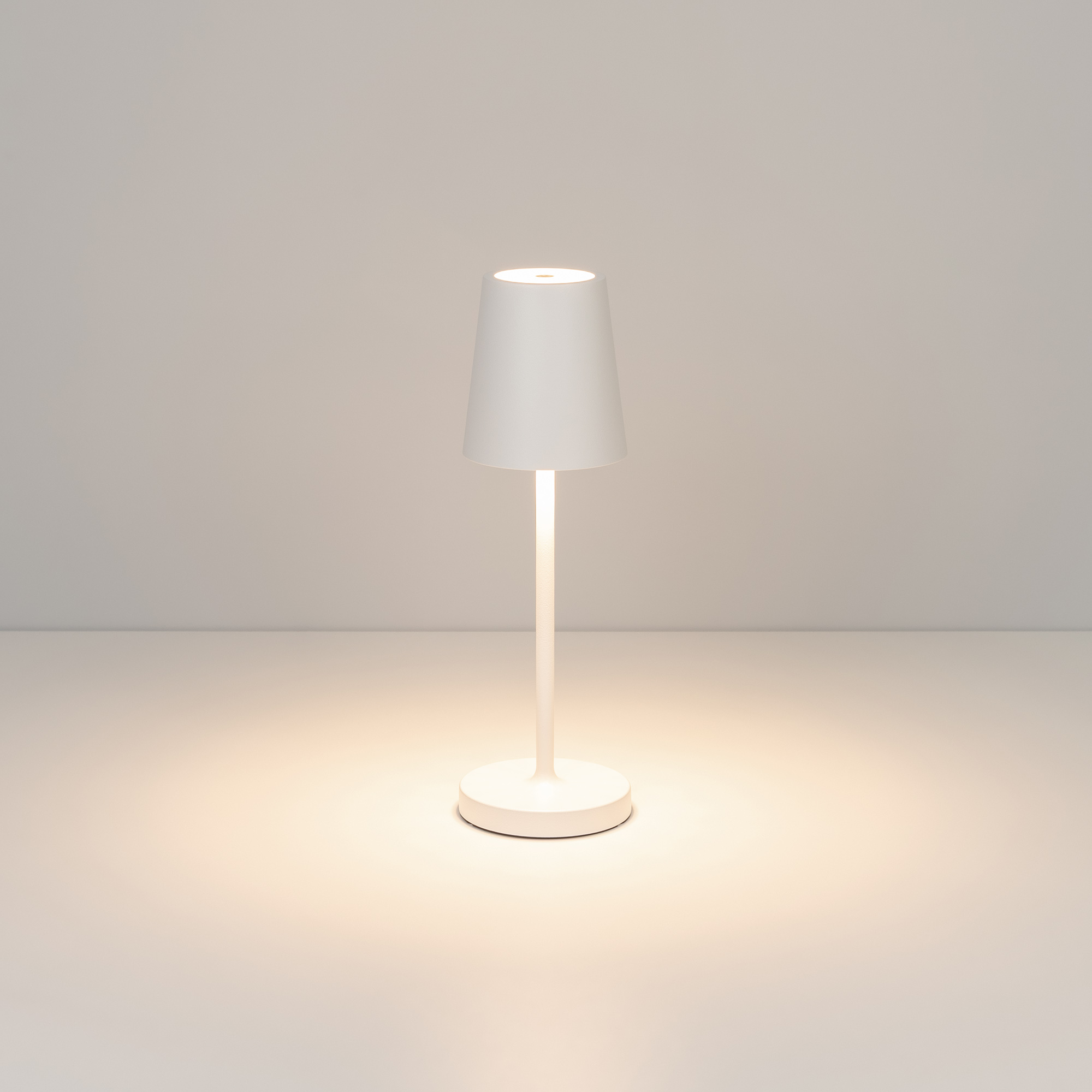 Настольный светильник со встроенным аккумулятором 1.5Вт, алюминиевый корпус, цвет белый. Цвет ТЕПЛЫЙ БЕЛЫЙ 2200-2700-3000K, св.поток 110-130 лм, CRI(Ra)>80, угол 90°. Размер Ф75x250мм. IP54. Зарядка от сети переменного тока AC220-240V. Тип встроенного аккумулятора 1500мАч Li-ion, напряжение батареи 3.7V