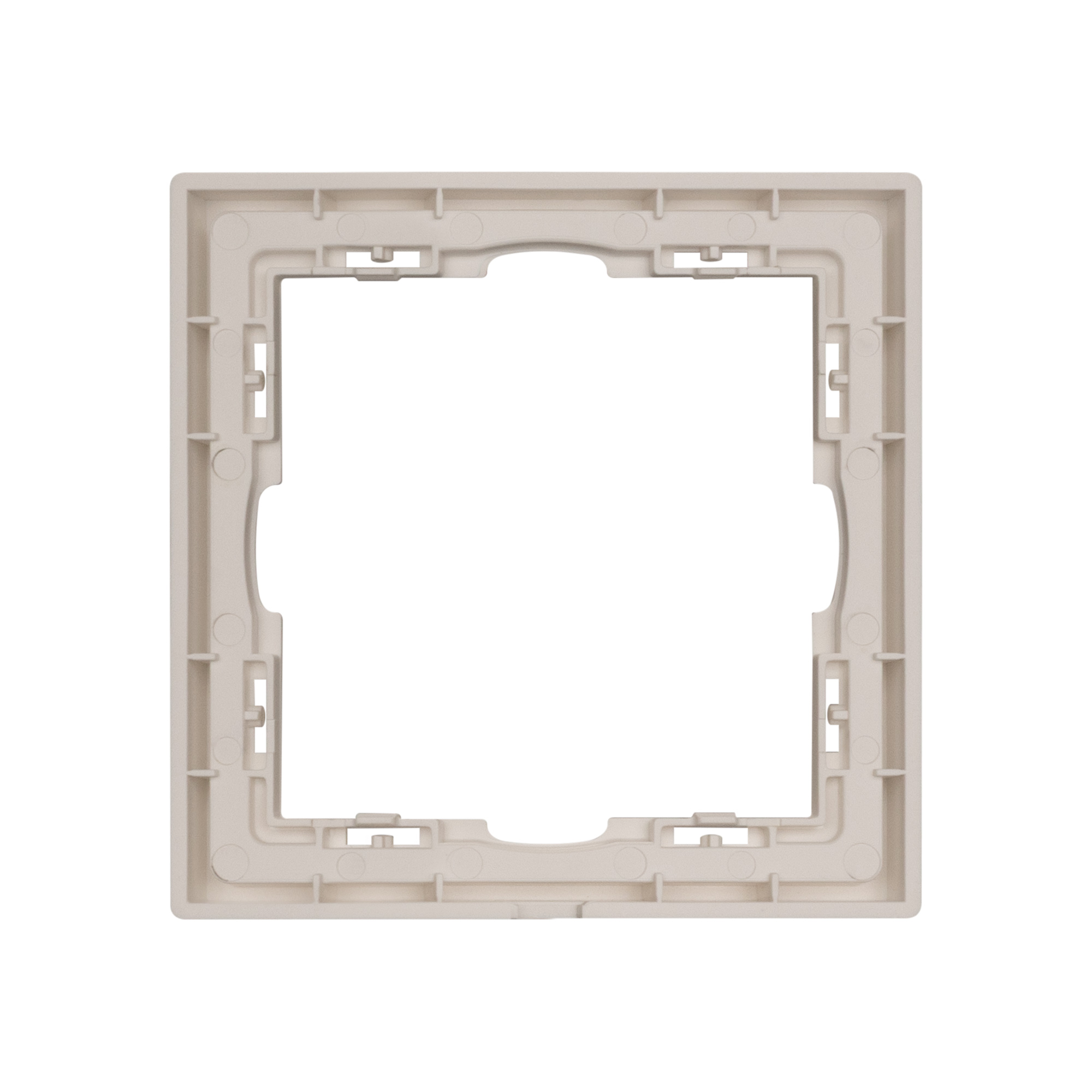 Корпус рамки выполнен в цвете кашемир и имеет покрытие Soft-Touch, что придает изделию приятные тактильные свойства. Толщина корпуса составляет 8,5 мм, что позволяет эффективно интегрировать рамку в интерьерные решения любого уровня сложности.
