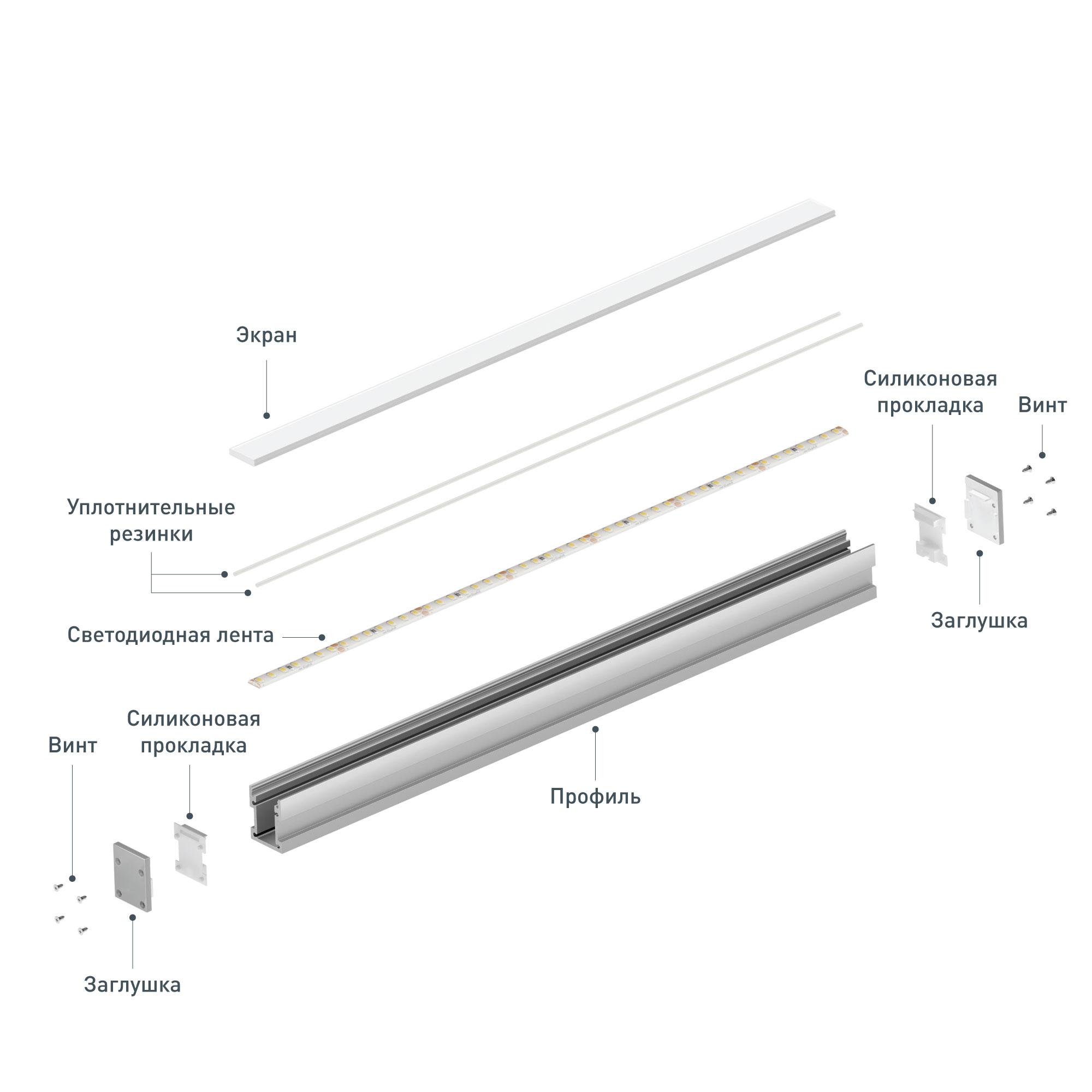 Экран, уплотнительные резинки, заглушки и другие аксессуары не включены в комплект и приобретаются отдельно. Цена указана за 1 метр профиля.