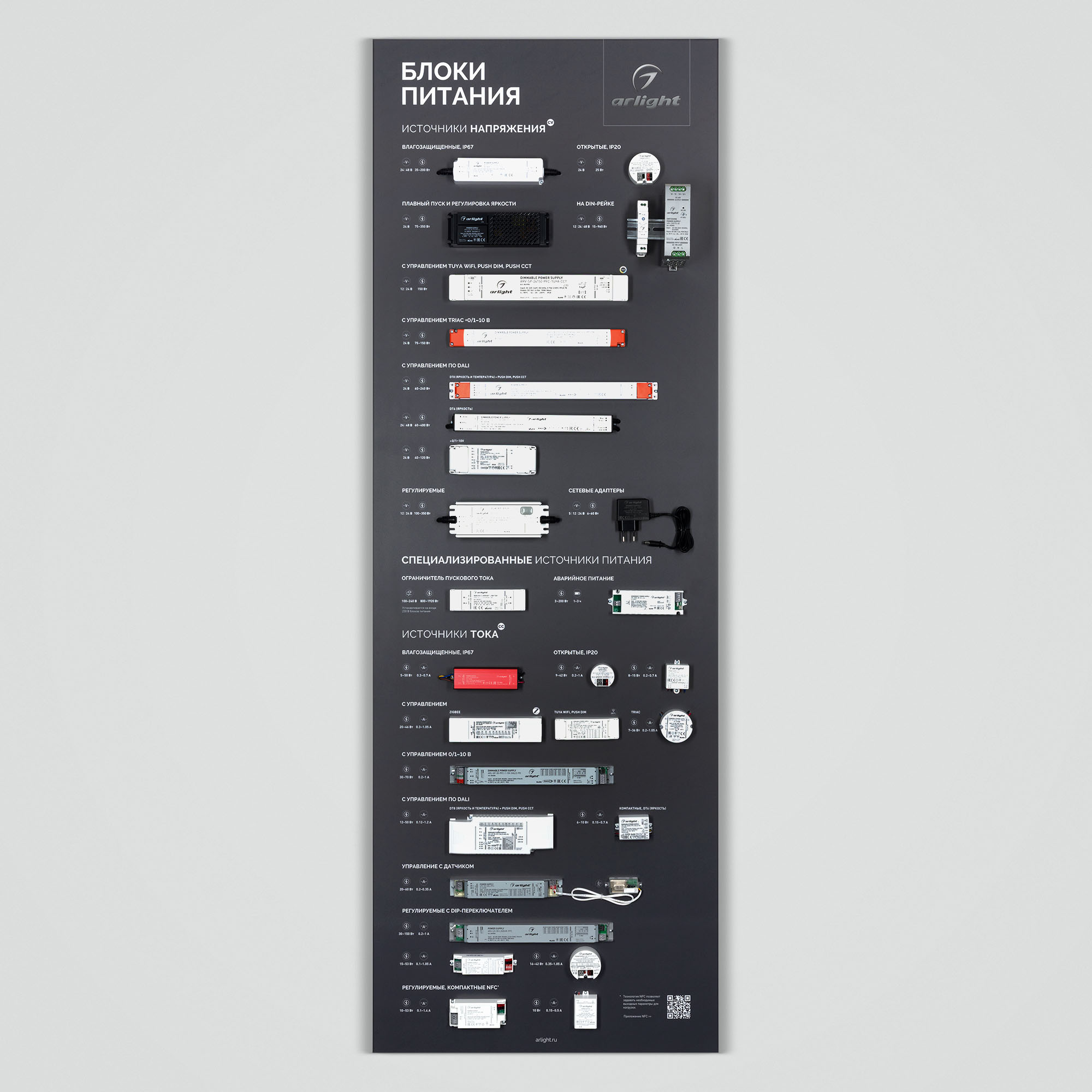 Представлен широкий ассортимент блоков питания Arlight для различных источников освещения: светодиодные ленты, светильники, мощные светодиоды и т. п. Показаны варианты встройки блоков питания в ниши и в профиль. Реализован механизм плавного включения светодиодной ленты. Материал корпуса стенда - алюкобонд 3 мм, пленка, печать.