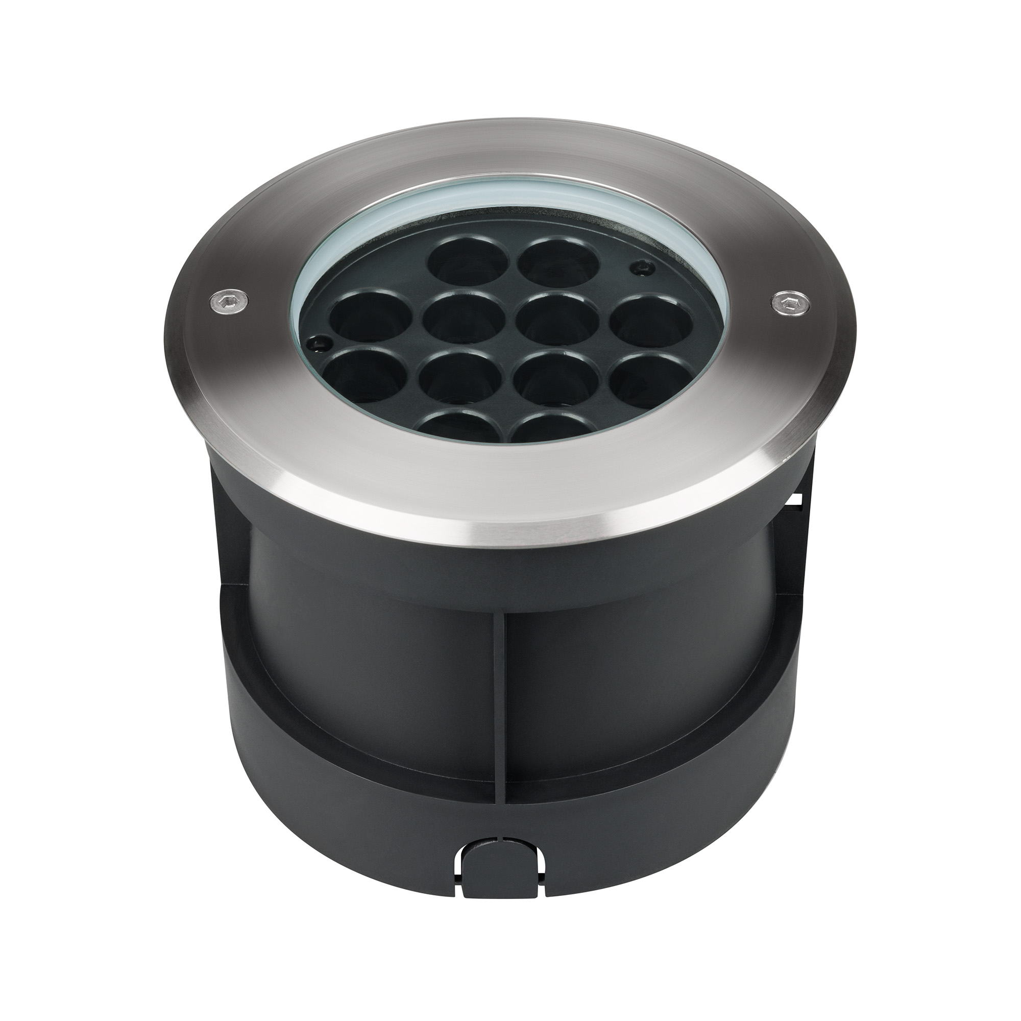 Встраиваемый светодиодный светильник для грунта и пола. Мощность 25 Вт, световой поток 2157 лм, цвет теплый 3000К. CRI(Ra)>80, угол 10°. Круглый влагозащищенный корпус IP67, нержавеющая сталь. Экран закалённое стекло. Питание 230В, 25Вт. Размер DxH Ø180x140мм. Установка в отверстие DxH Ø166x137мм.