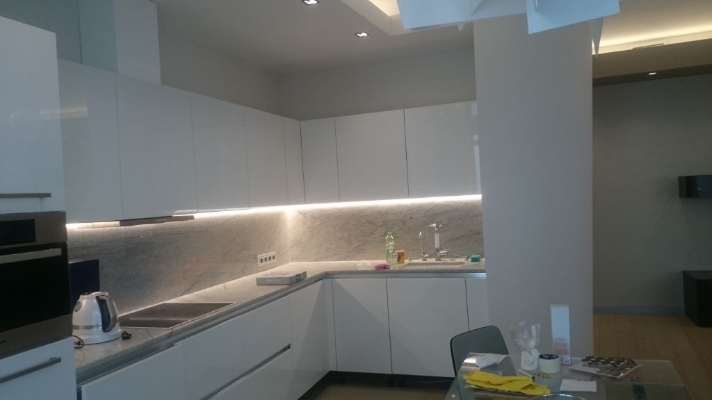 Подсветка потолков в данной квартире служит в основном в декоративных целях, то подсветка других зон функциональна. Основная из зон - это, конечно же, кухня, в которой была установлена подсветка всей рабочей поверхности - столешницы. Она установлена под верхними навесными шкафами и организована из светодиодной ленты и светодиодного профиля с матовым экраном, рассеивающим свечение ленты, делающим его более равномерным и защищающим ленту от попадания брызг. Включать и выключать подсветку, регулировать её яркость можно не нажимая кнопок, просто поднеся руку к бесконтактному датчику, что очень удобно когда руки заняты или мокрые.