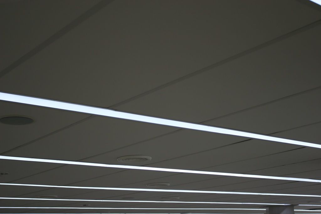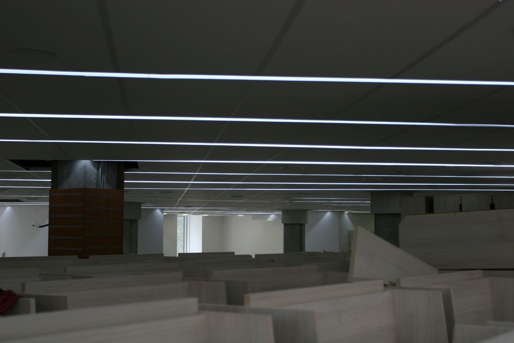 Светодиодное освещение торговых площадей в книжном магазине было выполнено двумя способами. Первый - освещение многоуровневого гипсокартонного потолка, второй - линейные светильники с матовым стеклом, встроенные в потолок Армстронг. Эти светильники создали эффект равномерных световых линий. В обоих вариантах освещения применялось светодиодная продукция торговой марки arlight®.